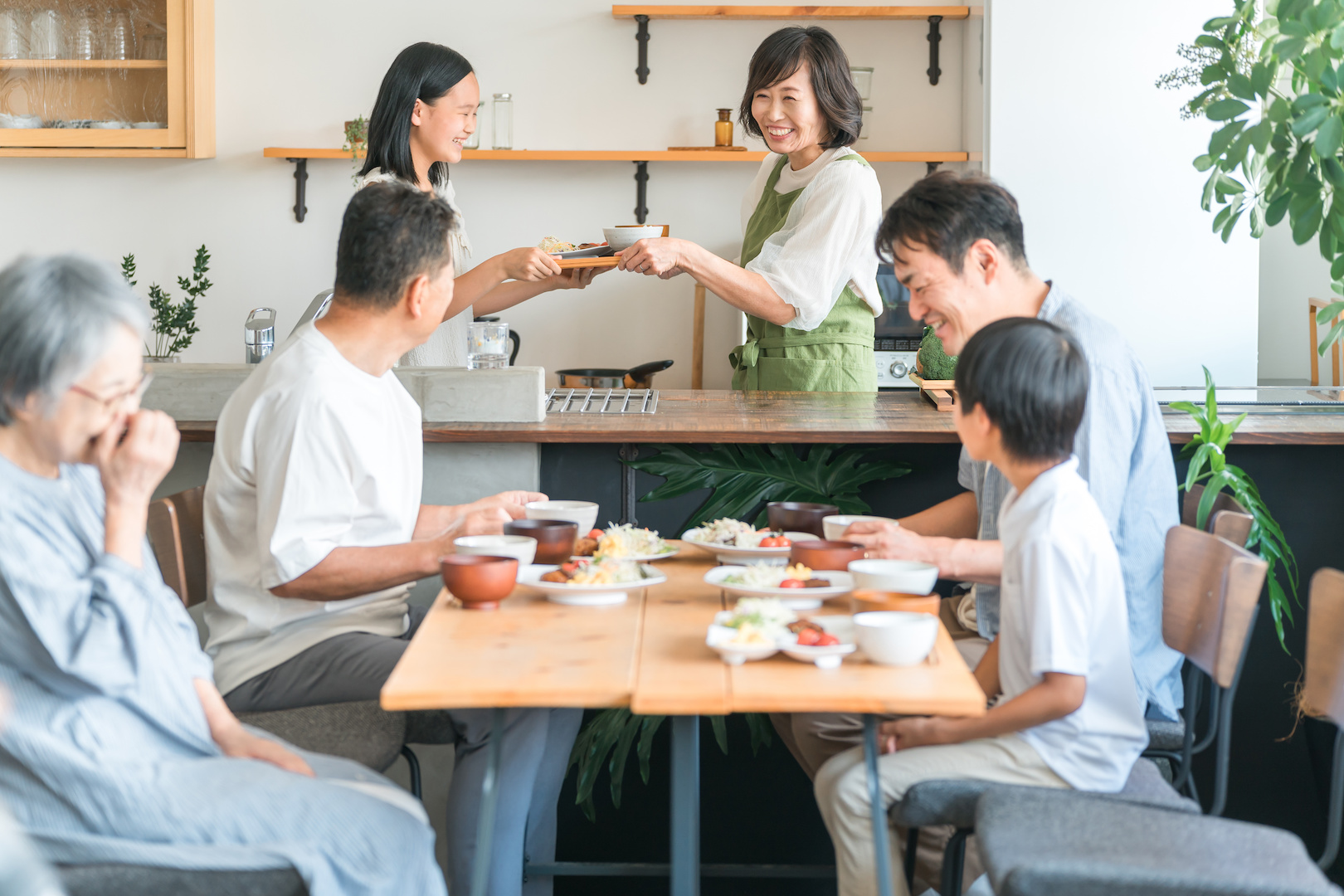 複数人で料理や配膳がしやすいだけでなく、調理中もダイニングやリビングにいるご家族と会話を楽しめるので、自然とにぎやかな雰囲気が生まれます。