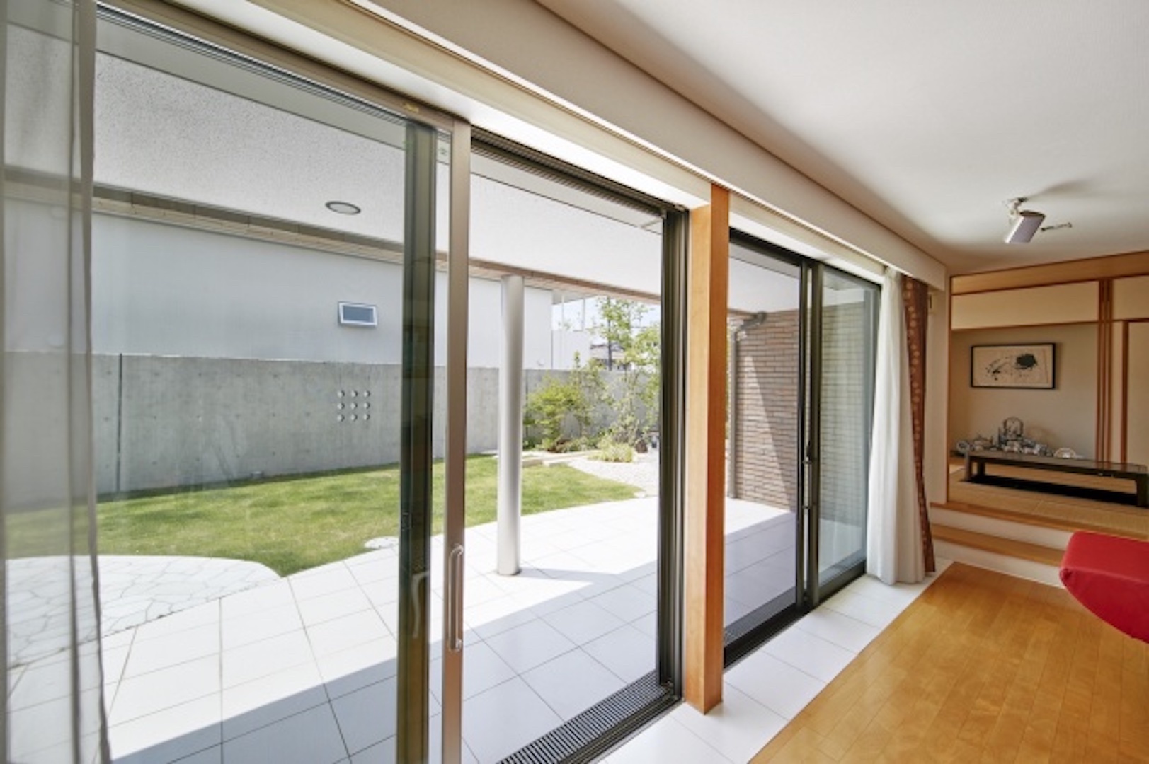 リビングの窓から段差なくフラットにつなげることで、室内空間がそのまま外へ広がったような開放感が生まれます。
