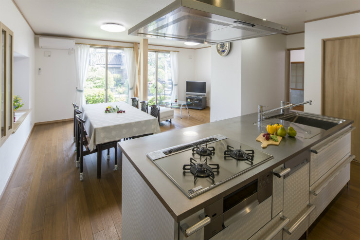 普段から来客が多いというこちらのお住まい。キッチンの前にはゆったりとしたスペースを確保しました。ゲストのために腕を振るいながら、会話にも花が咲く。そんな賑やかで楽しい時間が生まれるキッチンです。