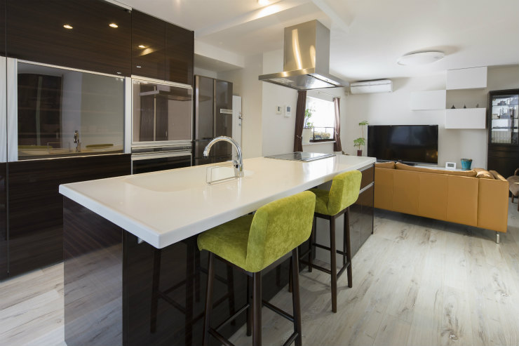 シックなダークブラウンで統一された、落ち着きのあるアイランドキッチンです。 滑らかな人工大理石のカウンターは、ゆったりとした広さを確保。ダイニング側にはアクセントとなるライトグリーンのハイチェアを合わせました。 カウンターに腰掛けた家族やゲストと会話を楽しみながら手を動かす。そんなコミュニケーションの生まれるキッチンなら、毎日の料理の時間がいっそう豊かなひとときになります。