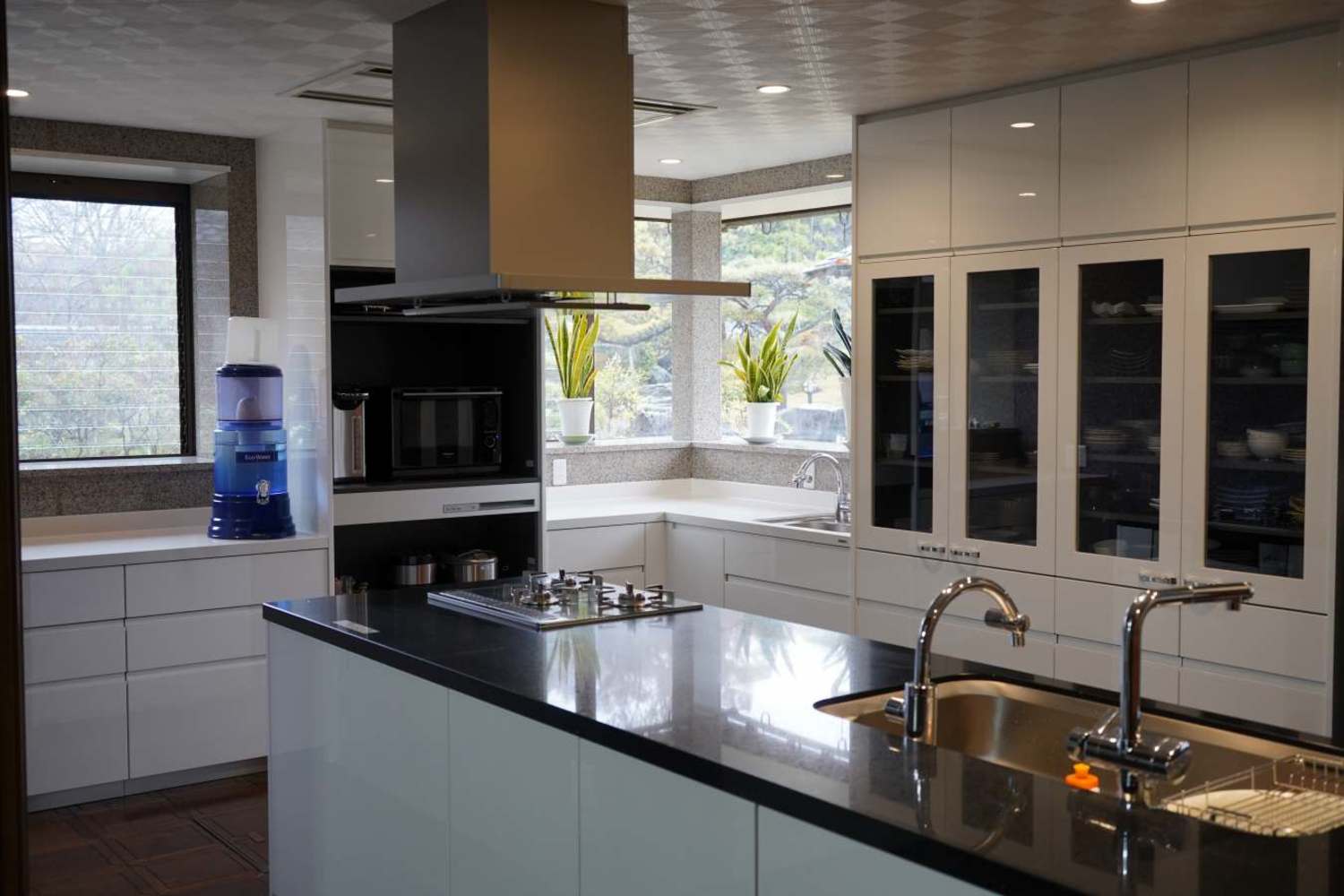 黒のワークトップに、艶やかな白の扉(面材)が映える、高級感あふれるアイランドキッチンです。 コーナーサッシを含む2面からたっぷりと自然光が入り、黒を使っていながらも空間全体は明るく開放的。