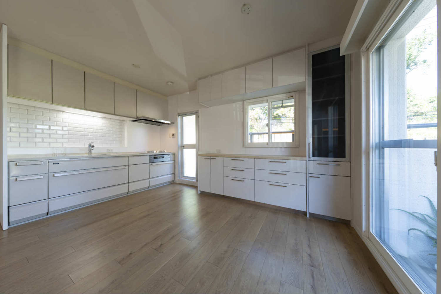対面キッチンから壁付けキッチンへと変更し、LDKを最大限に広く使えるようリフォームした事例です。 壁付けにすることでリビングダイニングの有効スペースが広がり、ゆとりのある開放的な空間が生まれました。内装は、明るくナチュラルなフローリングと木目の扉でコーディネートし、優しく調和させています。