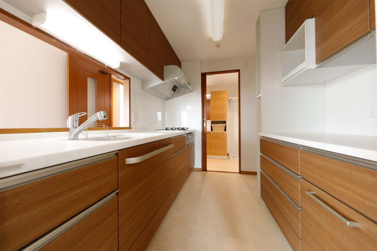 I型キッチンは、コンロ・シンク・作業スペースが一列に並んでいる、最も一般的なキッチンです。対面型の場合、上部に吊り戸棚を設置して収納力を高めることも可能ですし、吊り戸棚をなくしてより開放的な空間にすることもできます。
