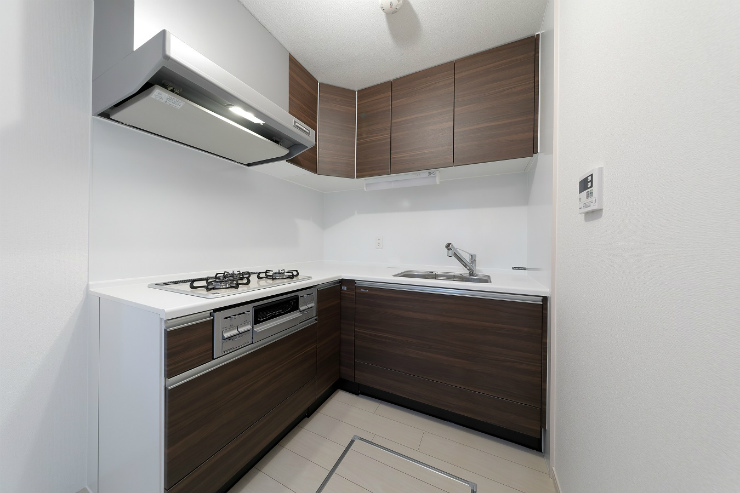 L型キッチンは、コンロとシンクがL字型に配置されたキッチンです。コンロ・シンク・冷蔵庫を結ぶ「ワークトライアングル」をコンパクトにまとめやすいのが特徴。作業スペースを広く取りつつ、効率的に作業できます。