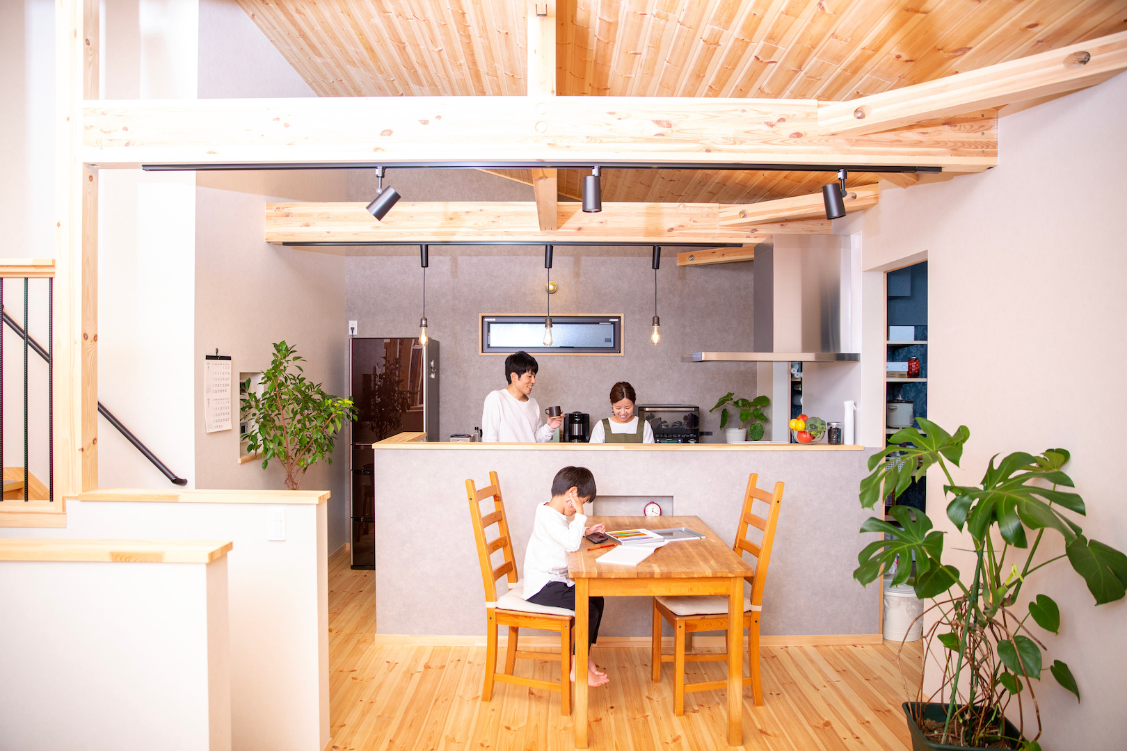 キッチンの上部は木目の美しい無垢板の下がり天井になっていて、上質さを感じる空間に。リビングダイニングの天井を印象付ける木の化粧梁との連続性も見事です。