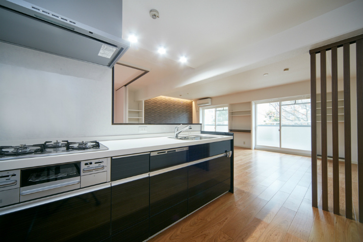 黒と白のモノトーンでシックにまとめた、シンプルな対面I型キッチンの事例です。以前あった吊り戸棚をなくし、照明をダウンライトに変更することで開放感が生まれました。キッチンの出入り口部分には、木のルーバーによる簡単な間仕切りを設置。空間を緩やかに区切りながらも、視線が抜けるので圧迫感がありません。