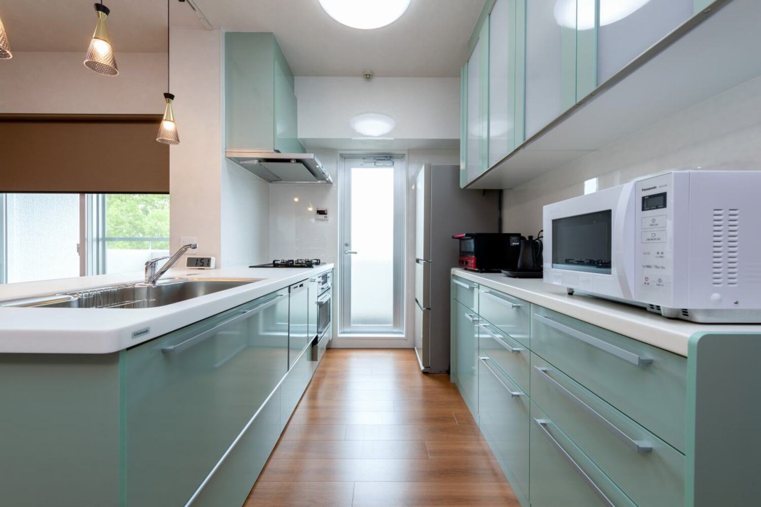 【事例2】くすみターコイズブルーとペンダントライトがおしゃれなI型キッチン