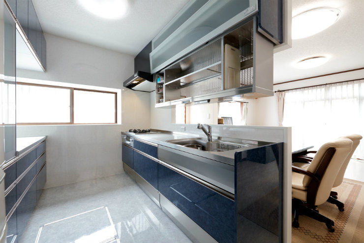インテリアは、キッチンとカップボードを艶のあるネイビーで統一し、上品で落ち着いた雰囲気に。 また、手が届きにくく「開かずの扉」になりがちな吊り戸棚には、電動昇降タイプを採用。ボタン一つで目の前まで下りてくるため、日常的にフル活用できる便利な収納に進化しました。
