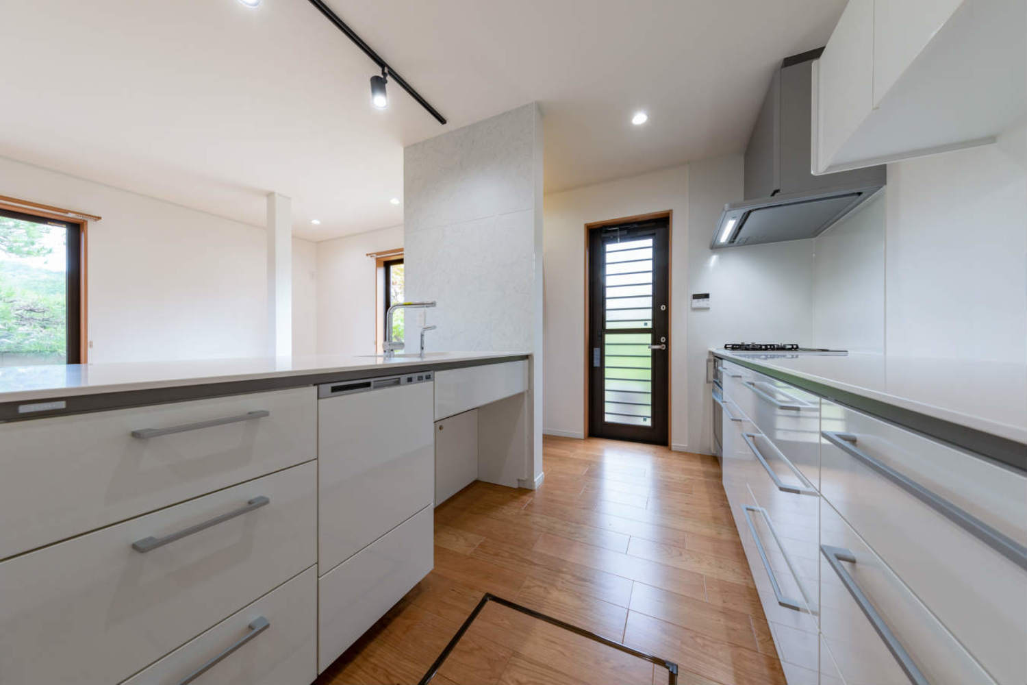ゆったりとしたスペースを確保した、独立型のキッチンです。ポイントは、リビングダイニング側に設けた「開口(窓)」。空間としてはしっかりと仕切りつつ、視線や声は届くため、キッチンにいても孤独を感じません。何かの時にはすぐ家族と会話ができる、程よい「こもり感」が魅力です。
