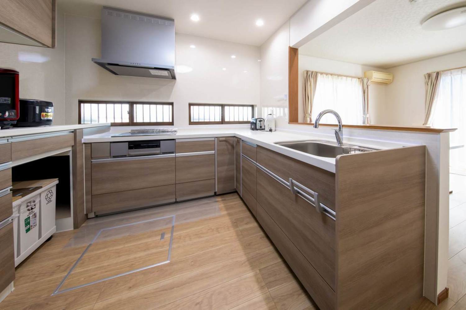 窓側(コンロ側)には仕切り壁を設けているため、ワークトップに調味料などを出しっぱなしにしても、リビングダイニングからは見えません。気になる手元の生活感をさりげなく隠せるのがメリットです。 背面には、キッチンとお揃いの大型カップボードを設置。生活感が出やすいゴミ箱も、あらかじめ設けた専用スペースにすっきりと収めました。