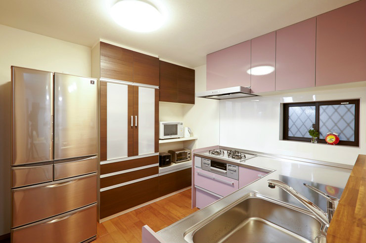 淡いピンクの扉が優しいアクセントになっているL型キッチンです。リビング側への視界を遮っていた吊り戸棚を撤去し、開放的な空間へ。収納量が減らないよう、背面には壁一面の大型カップボードを新設してカバーしました。