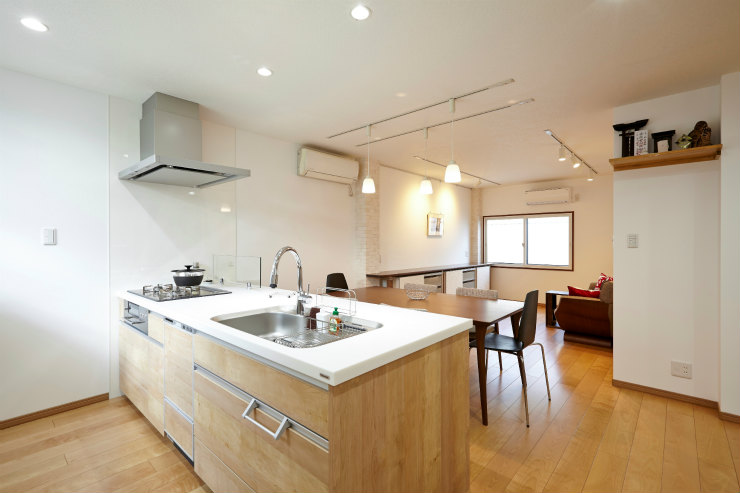 壁付けキッチンといえば、背を向けて料理をするためコミュニケーションが取りにくいと思われがちですが、こちらの事例はひと味違います。 キッチンのすぐ背面に、収納機能を備えた大型のダイニングテーブルを造作しました。