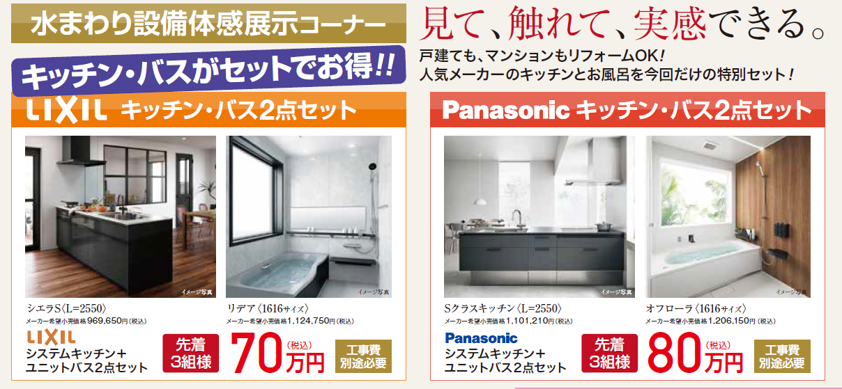 - 水まわり体感展示・・・システムキッチン、洗面化粧台、ユニットバス、トイレなど、お好きなメーカーからご自由にお選びいただけます。