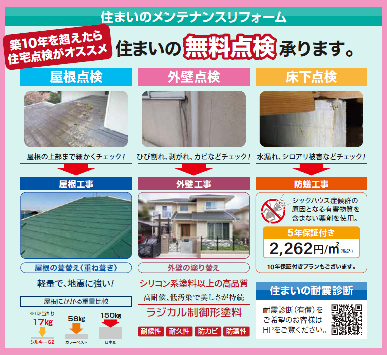 - 屋根・外壁リフォーム・・・外壁塗装、屋根葺き替えなどのご相談受付。