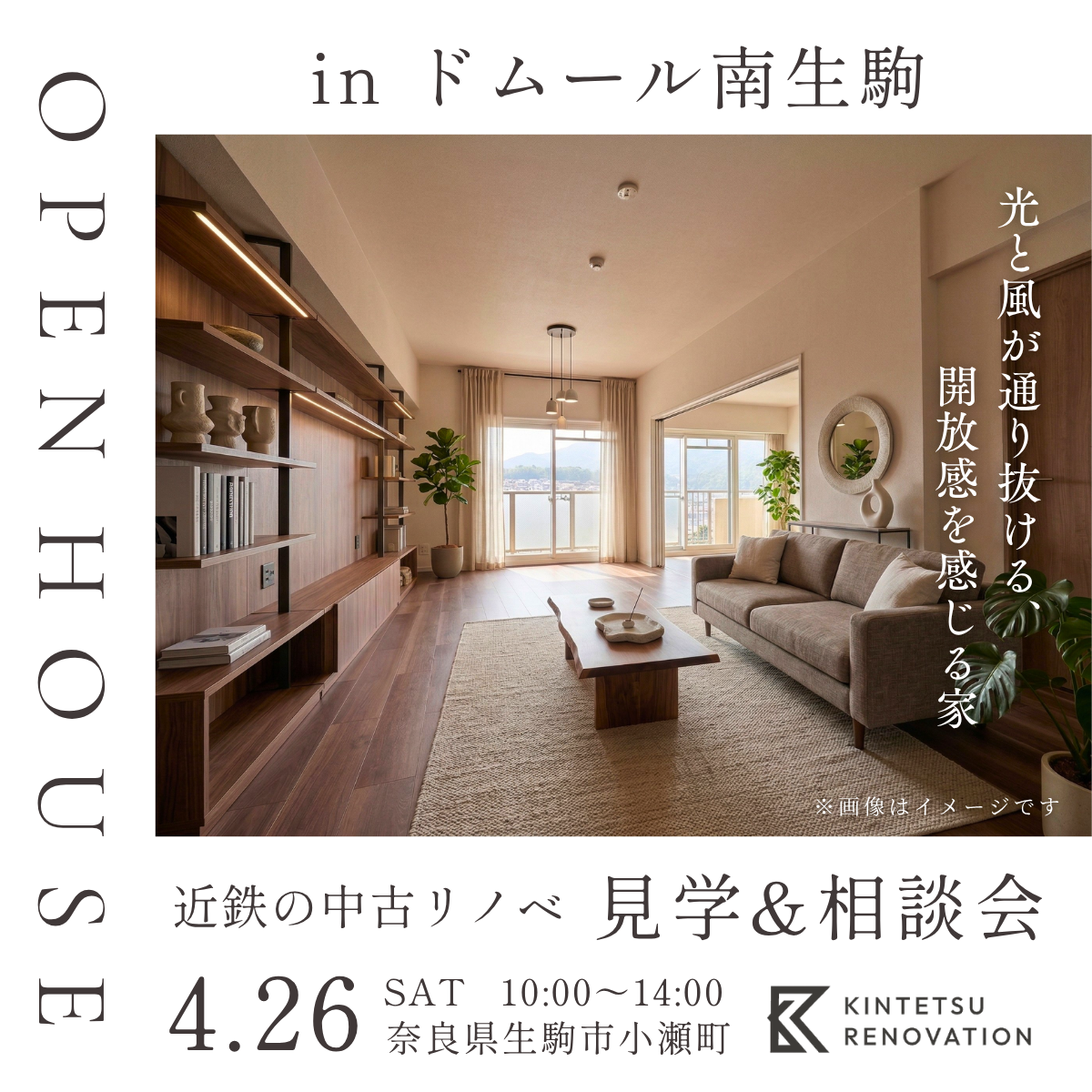 生駒市小瀬町「ドムール南生駒」にて、リノベーション完成見学会を開催します。 今回の見学会では、4LDKを活かしたゆとりある間取り、最新設備、素材感にこだわった内装など、実際の暮らしをイメージしやすい仕上がりをご覧いただけます。