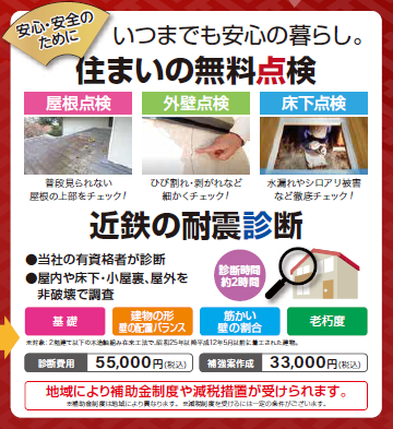 屋根・床下・外壁の3点無料点検を実施中! 専門スタッフがしっかりチェックし、現状をわかりやすくご報告します。