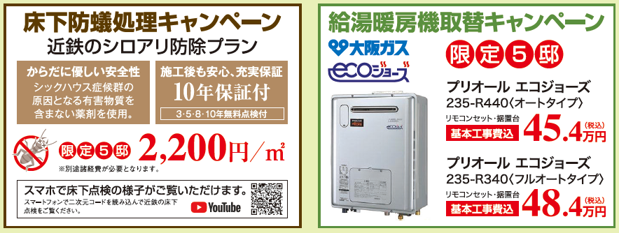 他にも、防蟻処理や給湯暖房取替などお得なキャンペーンを実施中です。