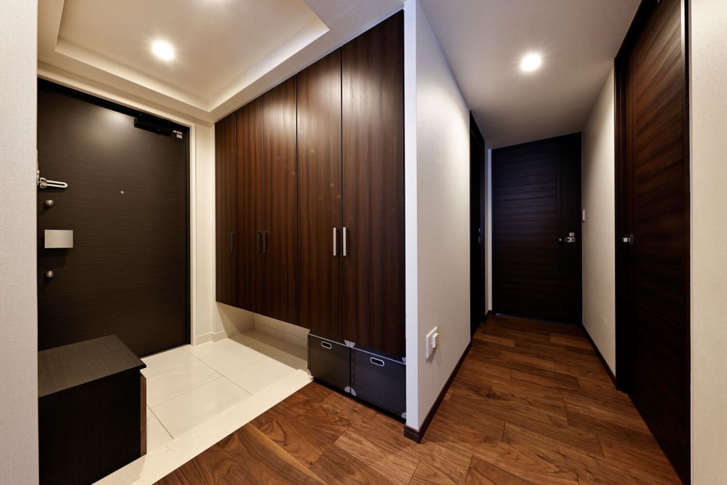 玄関空間にも細やかなこだわりを詰め込みました。訪れる人を温かく迎え入れるダウンライトと、充実した収納を備えた靴箱により、デザイン性と機能性を両立させた、上質なエントランスが実現しました。